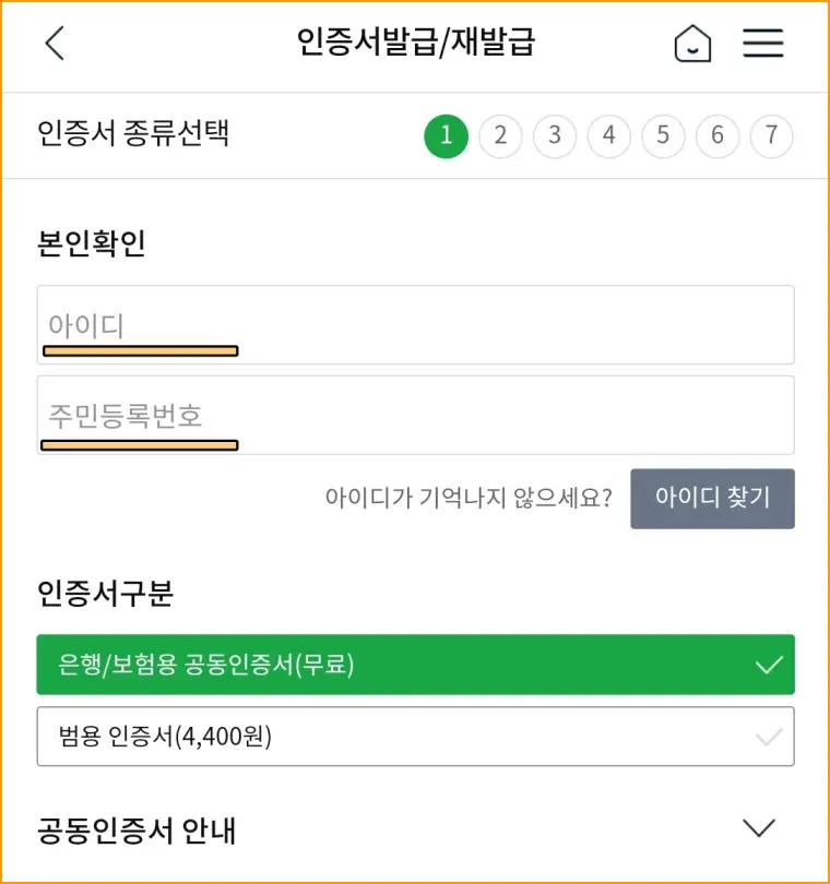 ▲ 본인 확인을 위해 아이디 / 주민등록번호를 입력해 줍니다. 그리고 아래의 인증서를 선택해 주세요. ( 저는 무료 인증서로 진행하겠습니다. )