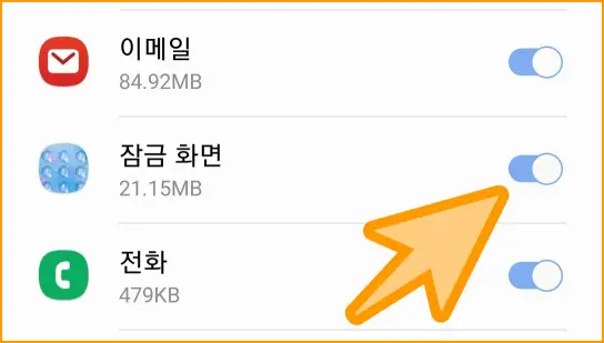 ▲ 스크롤을 내려서 본인이 설치한 [잠금 화면] 앱 이름을 찾아서 우측 활성화 버튼을 눌러줍니다. 뒤로 돌아가서 [시스템 설정 변경]에서도 활성화시켜주세요.