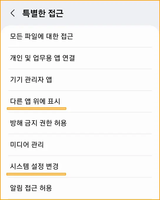 ▲ [다른 앱 위에 표시] 우선 설정한 후에 [시스템 설정 변경]을 할 것입니다. 우선 [다른 앱 위에 표시] 먼저 선택해 주세요.