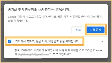 ▲ 다시 한번 동기화 사용을 중지할 거냐는 창이 나타납니다. 자세히 보시면 "Google 계정에서 로그아웃됩니다. " 라는 문구를 확인할 수 있습니다.하단의 체크박스에 체크해주고, [사용 중지]를 눌러줍니다. 체크하지 않으면 크롬에서는 로그아웃되더라도 해당 기기에는 북마크, 방문기록, 비밀번호가 남게 되기 때문입니다.