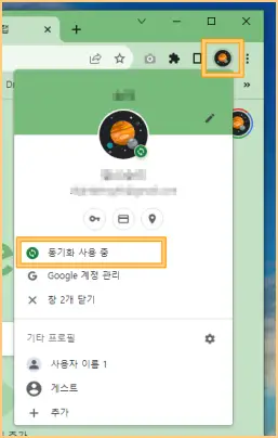 ▲ 크롬 브라우저의 우측 상단에 본인의 [계정 아이콘] 클릭합니다. 아이콘을 설정한 분들은 저처럼 별도의 이미지가 떠있을 것이고, 그렇지 않다면 평범한 아이콘으로 보일 것입니다. 아이콘을 누르면 본인의 프로필과 각종 메뉴가 나타납니다. 여기서 [동기화 사용 중] 클릭합니다.