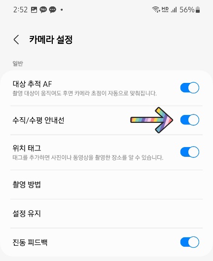 ▲ [수직/수평 안내선] 항목을 클릭해주시면 오른쪽 스위치 아이콘이 켜짐으로 바뀌는 것을 볼 수 있습니다. 이제 네이게이션바의 [ 뒤로가기 ]를 누르시거나, 좌측 상단에 왼족 화살표인 [ < ]표시를 눌러 카메라 촬영 화면으로 돌아갑니다.