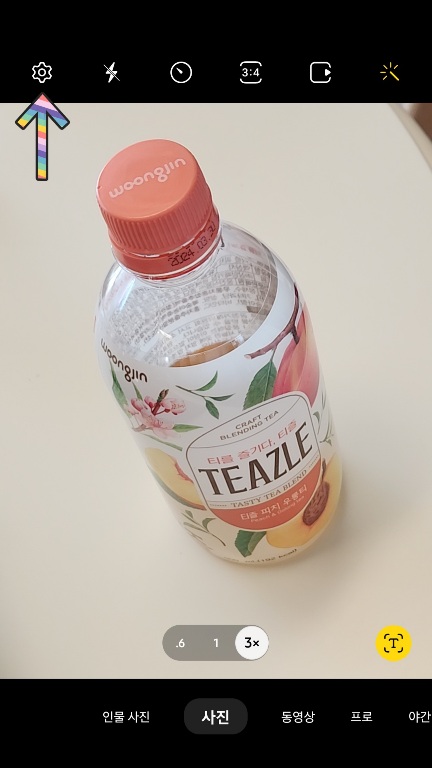 ▲ 카메라가 켜졌다면 화면 상단의 다양한 아이콘들을 볼 수 있습니다. 그중에 첫번쨰에 위치해있는 '톱니바퀴' 모양의 아이콘을 눌러주세요. 아마 대부분 첫번째 부분에 톱니바퀴 아이콘이 있을 것입니다. 바로 이 아이콘이 카메라 설정 아이콘입니다.