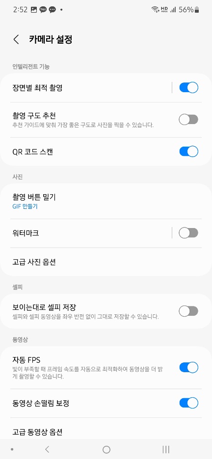 ▲ 카메라설정 화면입니다. 스크롤을 조금만 내려주시면 [수직/수평 안내선] 항목이 있습니다.