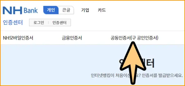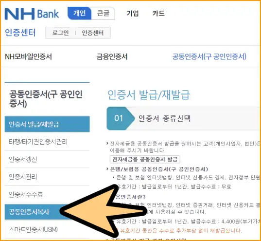 - PC에서 NH뱅크 인증센터 접속 ▶ [공동인증서] 탭 선택 ▶ [공동인증서 복사] 선택