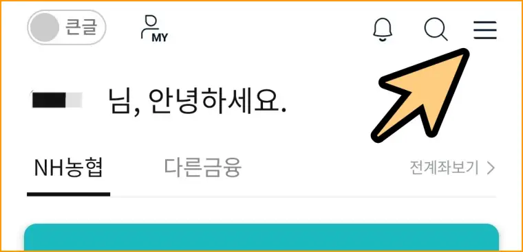 ▲ 농협스마트뱅킹 앱을 실행하면 우측상단 3선 메뉴가 보입니다. 선택해 주세요.