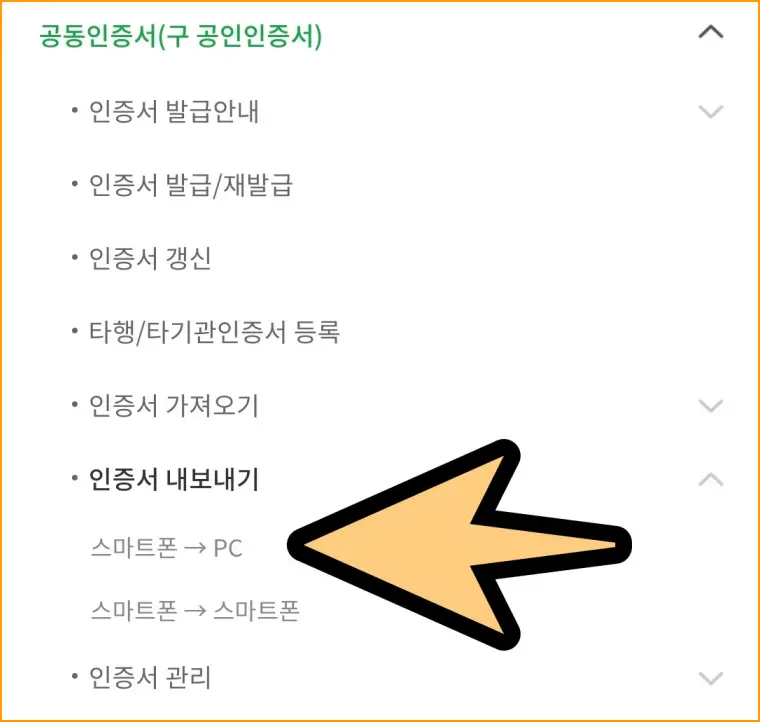 - [인증서 내보내기] 펼치기 ▶ [스마트폰-PC] 선택 ▶ 안내문 확인