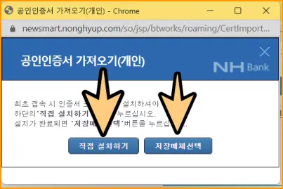 ▲ 공인인증서 가져오기 프로그램이 필요하므로, 요구하는 프로그램을 [직접 설치하기]를 통해 설치한 후에 [저장매체 선택]을 진행해 주세요.