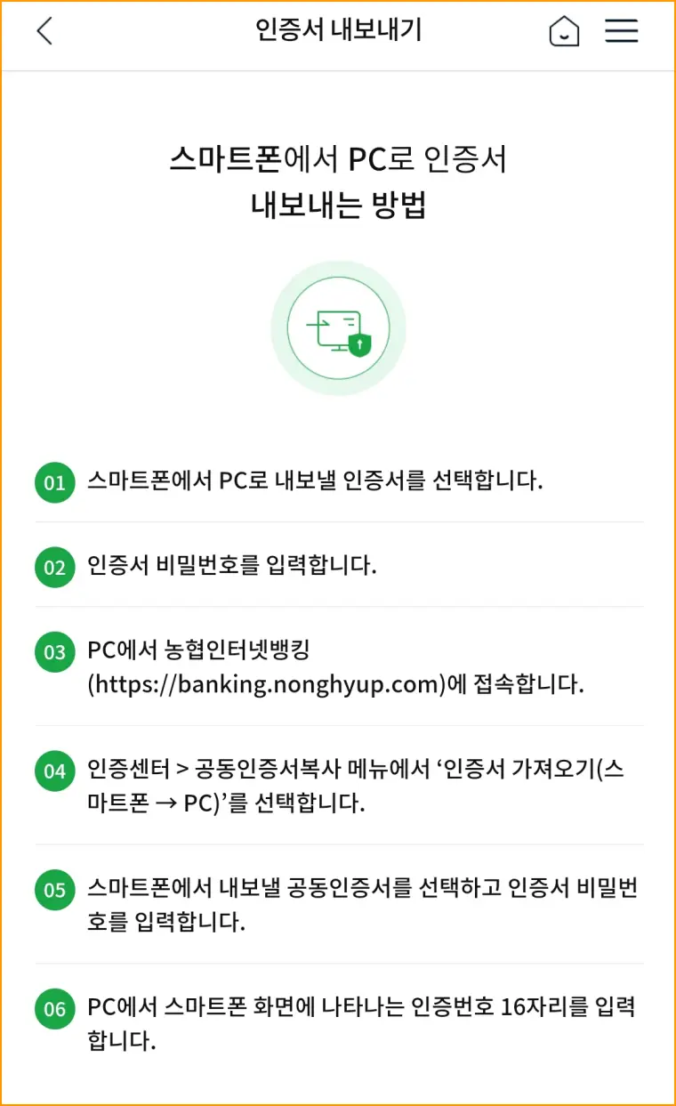 스마트폰에 발급받은 농협 공동인증서를 PC에서도 이용할 수 있게 PC로 내보내기를 진행해 보겠습니다. 단계는 많지만 간단하니 잘 따라와 주세요.