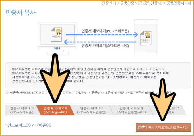 ▲ [인증서 가져오기(스마트폰->PC)]을 선택한 후, 우측에 있는 인증서 가져오기를 눌러주세요.