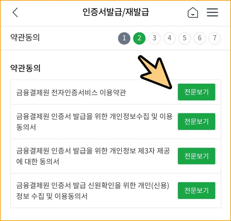▲ 약관 내용을 확인하셔야 다음 단계로 진행됩니다. [전문 보기]를 누르고 약관을 확인하세요.