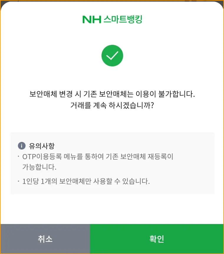 ▲ 보안매체는 1인당 1개의 보안매체만 사용할 수 있습니다. 확인 눌러주세요.