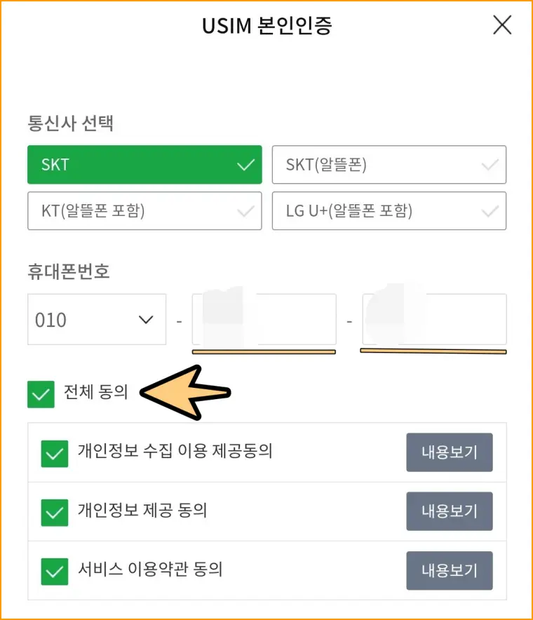 ▲ 본인 휴대전화의 [통신사선택], [번호 입력]해주시고 약관에 [전체 동의] 체크해 줍니다.