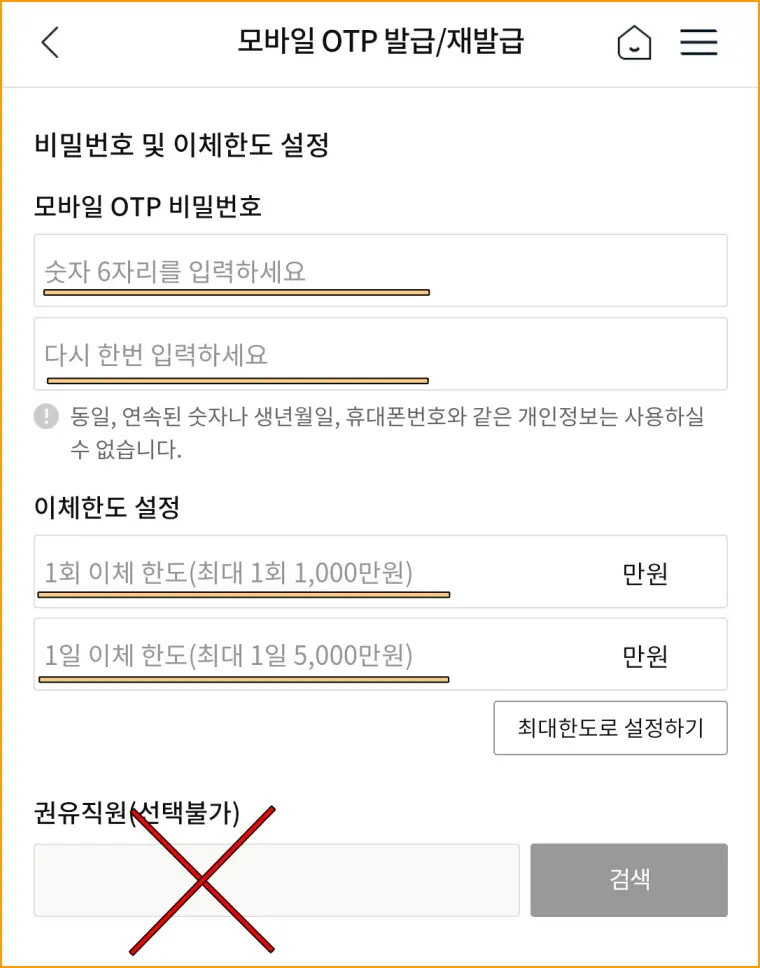 ▲ 모바일 OTP 비밀번호를 입력해 주세요. 앞으로 OTP 인증이 필요할 시 이 비밀번호로 인증되니 반드시 기억해 주세요. 본인에게 필요한 이체한도 설정까지 진행해 줍니다.