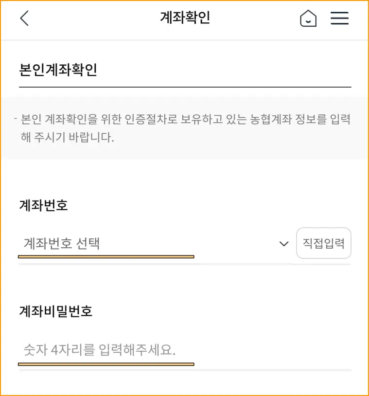 ▲ 본인 명의의 계좌를 확인해야 합니다. 본인 계좌번호와 비밀번호 입력합니다. 본인의 정보와 일치해야 다음 단계로 진행할 수 있습니다.
