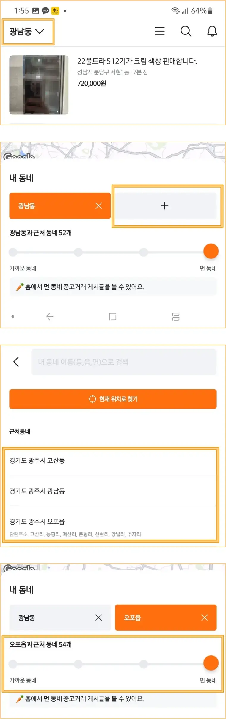 이럴 때 바로 [동네 확장] 기능을 활용하면 더 많은 중고 물건들을 거래할 수 있습니다. 당근 마켓 앱을 실행해서 좌측 상단 [내 동네] 메뉴 선택하면 [내 동네 설정]을 할 수 있습니다. [내 동네 설정]의 우측 [+ 버튼]을 누르면 겹치는 인근 지역을 추가로 하나 더 등록가능합니다.