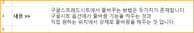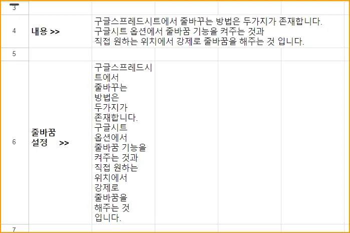 ▲ 4행에 있던 긴 글이 줄 바꿈을 통해 6행처럼 줄바꿈 되었습니다. 하지만 어떤가요? 셀의 폭에 맞게 텍스트가 줄 바꿈 된 것이기 때문에 가독성이 매우 떨어집니다. 원하는 위치에서 줄 바꿈이 되도록 해보겠습니다.