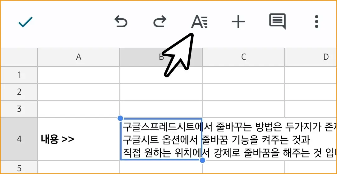 기본적인 줄 바꾸기는 원하는 영역을 지정하고 스프레드시트의 줄 바꿈 옵션을 적용하면 됩니다. 시트의 일정한 영역 전체를 바꿀 때 효율적입니다. 하지만 이 방법은 원하는 위치에서 줄 바꿈이 불가능하죠. 즉, 가독성이 떨어지는 방법입니다. 그래서 원하는 위치에서 줄 바꿈을 하기 위해서는 다른 방법을 사용할 수 있습니다.