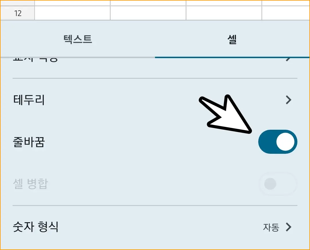 - 줄 바꿈 할 셀 선택 > 상단 메뉴바의 ‘A’모양 아이콘 > '셀'탭 선택 > 줄바꿈 스위치 켜기