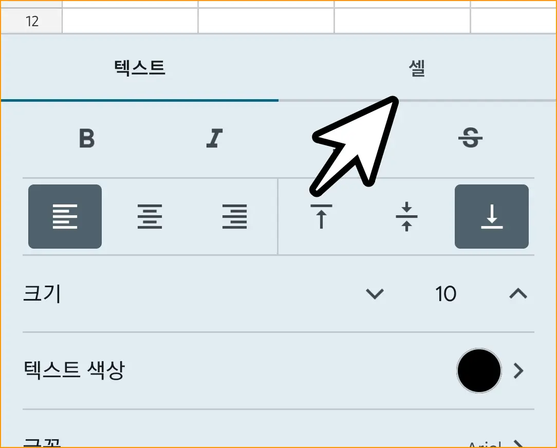 ▲ 그럼 화면 하단에 세부 메뉴가 뜨게 됩니다. 우측에 있는 '셀'탭을 눌러주세요.
