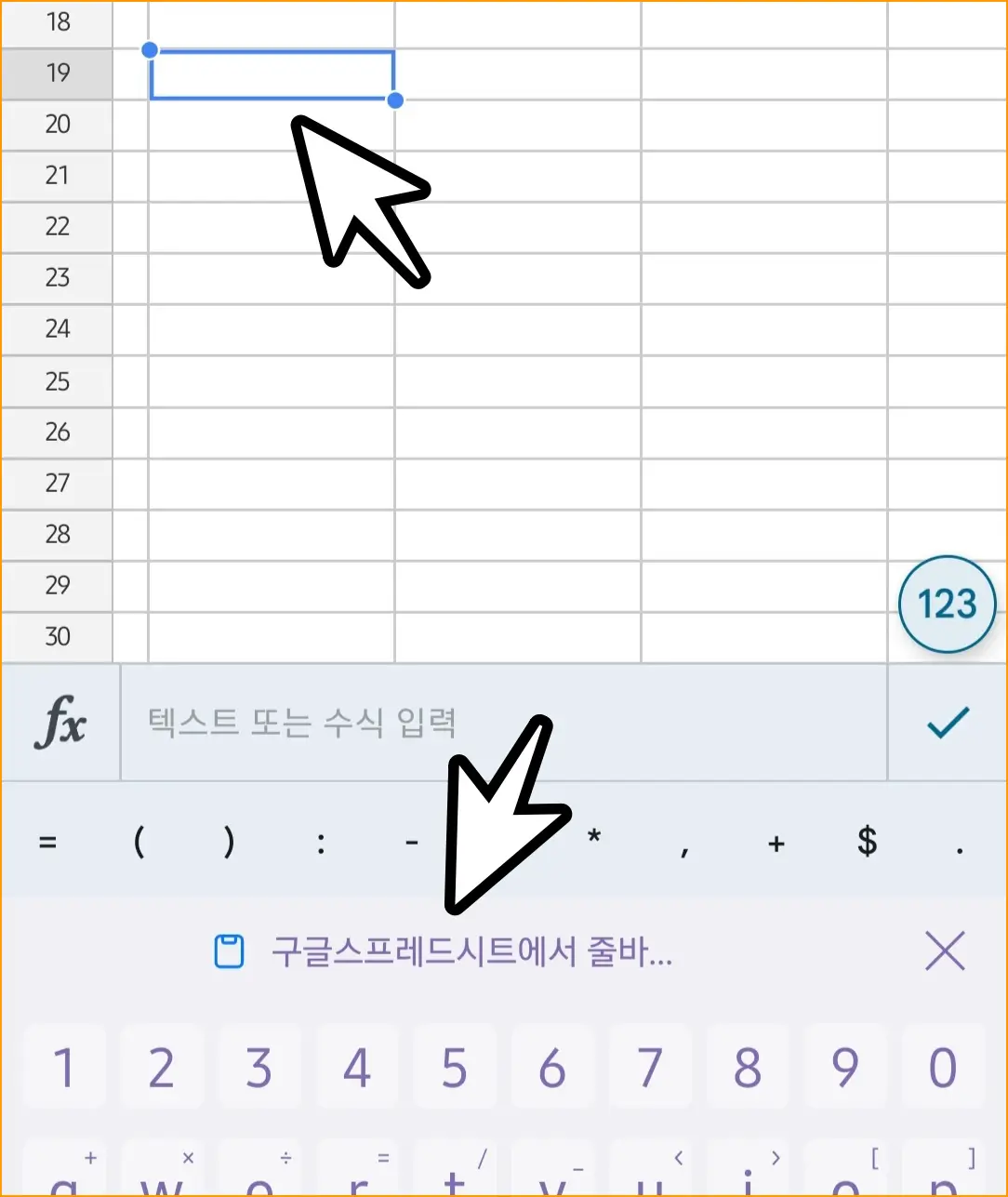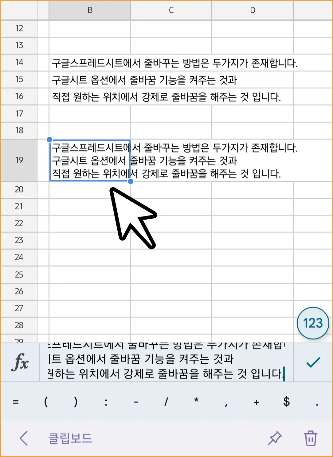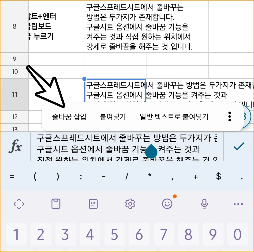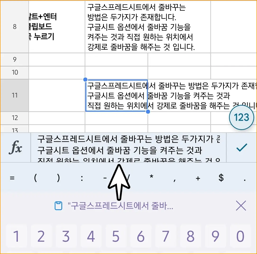 ▲ 줄바꿈하고자하는줄 바꿈 하고자 하는 셀을 눌러주세요. 셀을 누르면 키보드가 열리면서 해당 셀의 편집창이 활성화됩니다. 여기서 줄 바꿈 하고자 하는 위치를 정해줍니다.