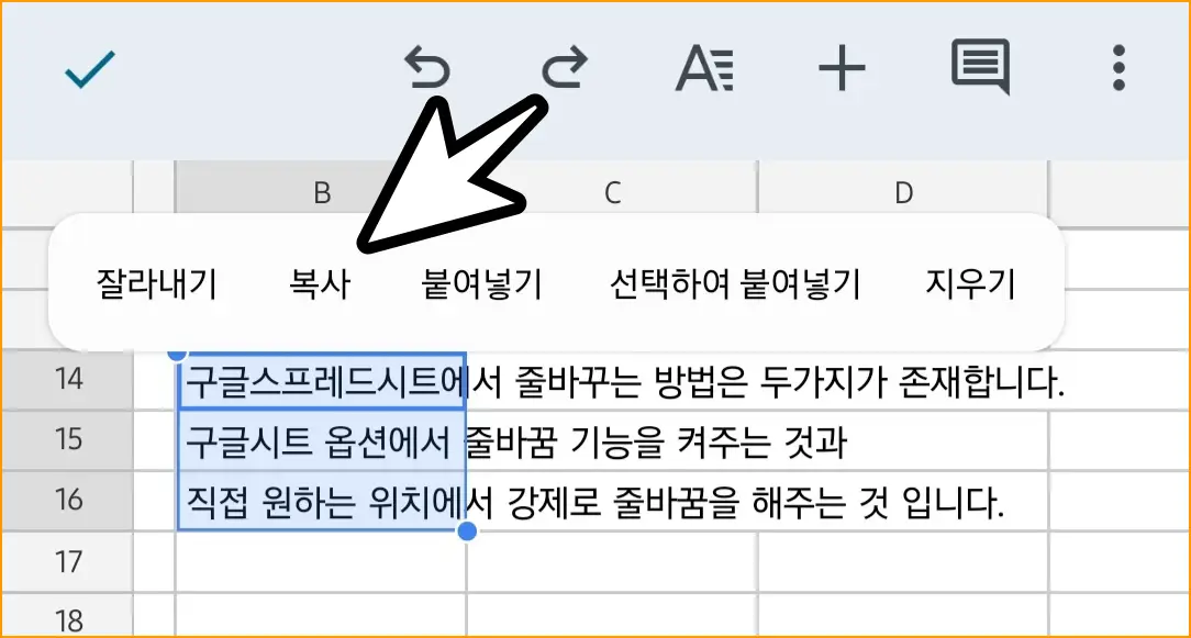▲ 글이 작성된 셀 전부를 영역 지정해 주고, 복사를 눌러줍니다. 위의 예시에서는 B열 14-16행의 셀 안에만 글이 작성되어 있으니 이 세 칸을 잡고 복사를 해주었습니다.