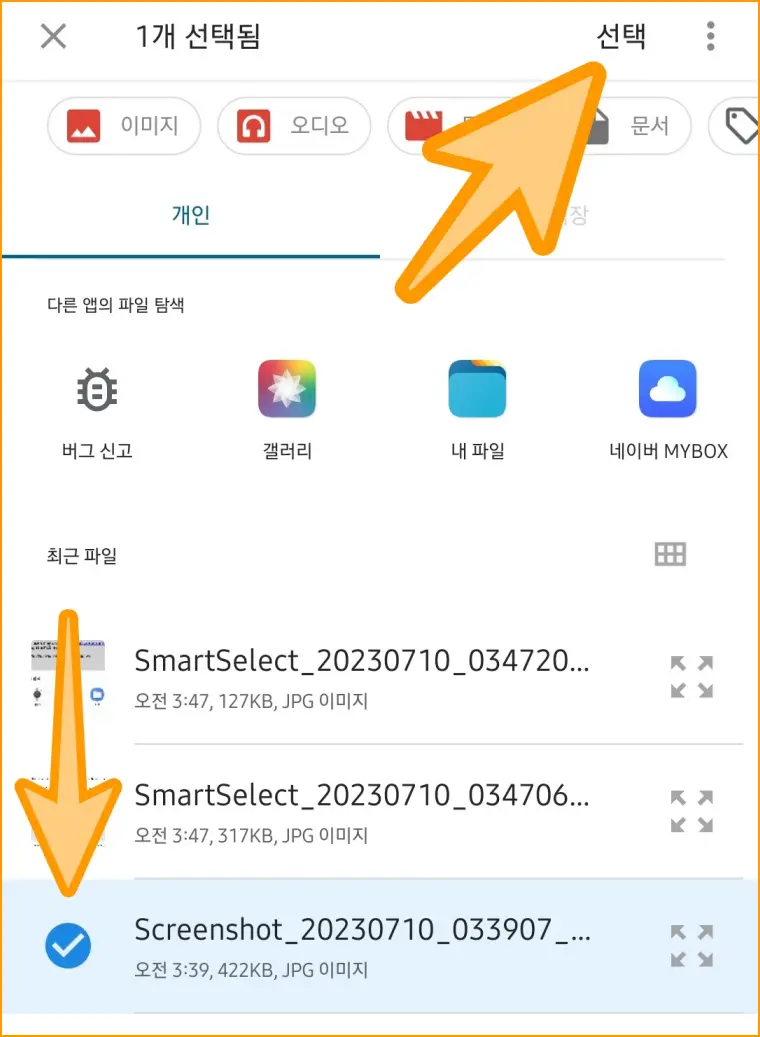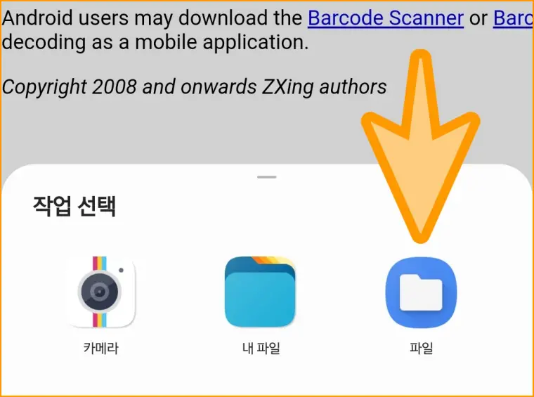 ▲ 카메라와 파일탐색기 2종류가 나오는데 가장 우측 [파일]을 선택해 주세요.