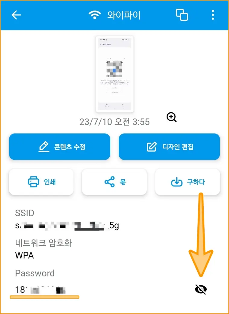 ▲ 바로 비밀번호가 나왔습니다. Password 우측의 [눈모양] 선택하면 본인 스마트폰에 연결되어 있는 비밀번호를 확인할 수 있습니다. 오늘은 WiFi 암호를 모를 때 공유기 RESET 없이 비밀번호를 찾을 수 있는 방법에 대해서 알아보았습니다. 도움이 되었길 바랍니다.