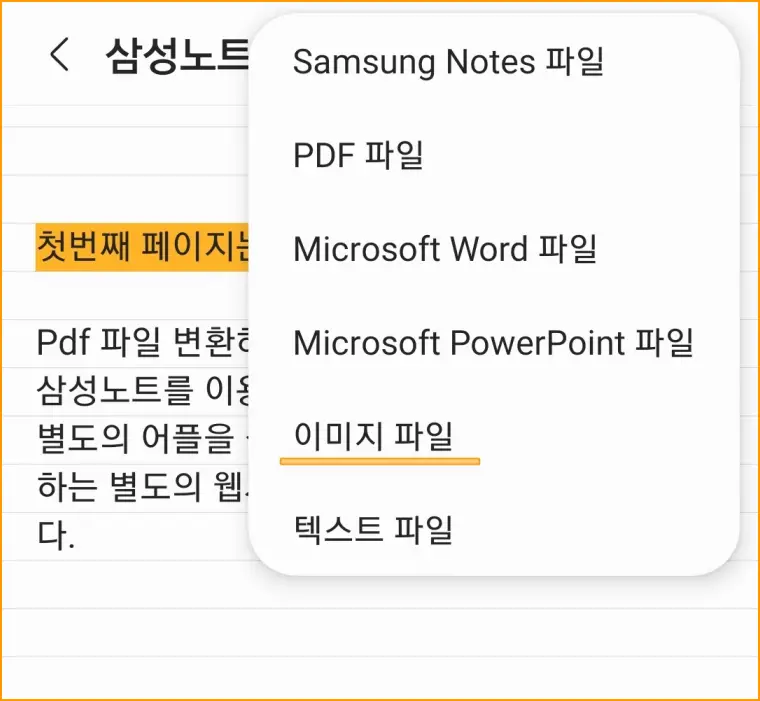 - 더 보기 ▶ 다른 앱에서 열기 ▶ samsung notes 노트로 변환