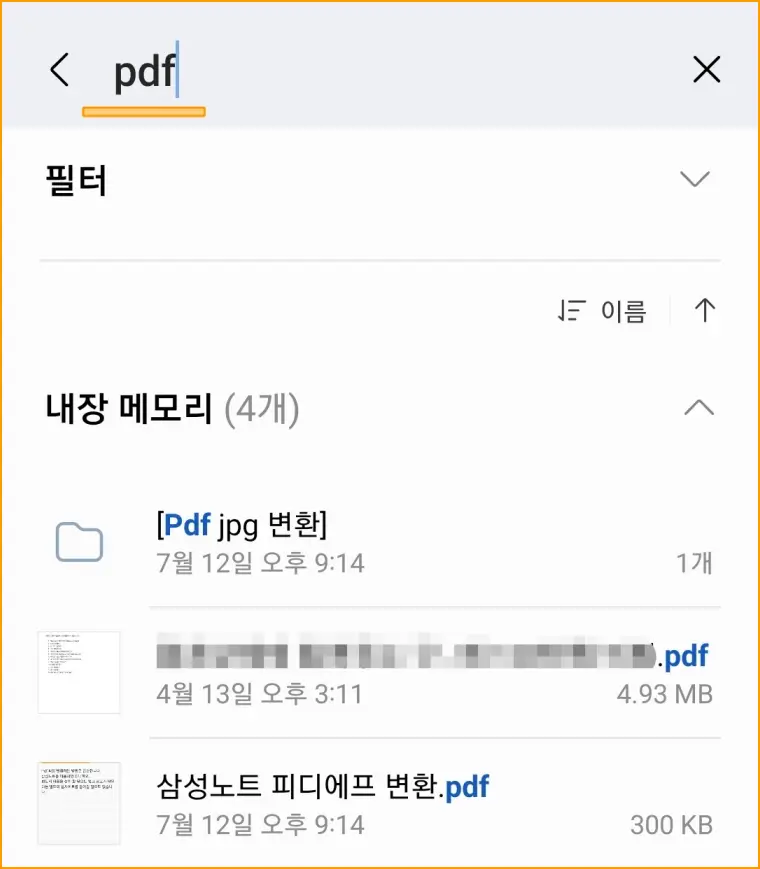 ▲ 상단의 [돋보기] 아이콘을 누르고 pdf를 검색하면 스마트폰에 저장된 pdf파일들을 전부 확인할 수 있습니다.