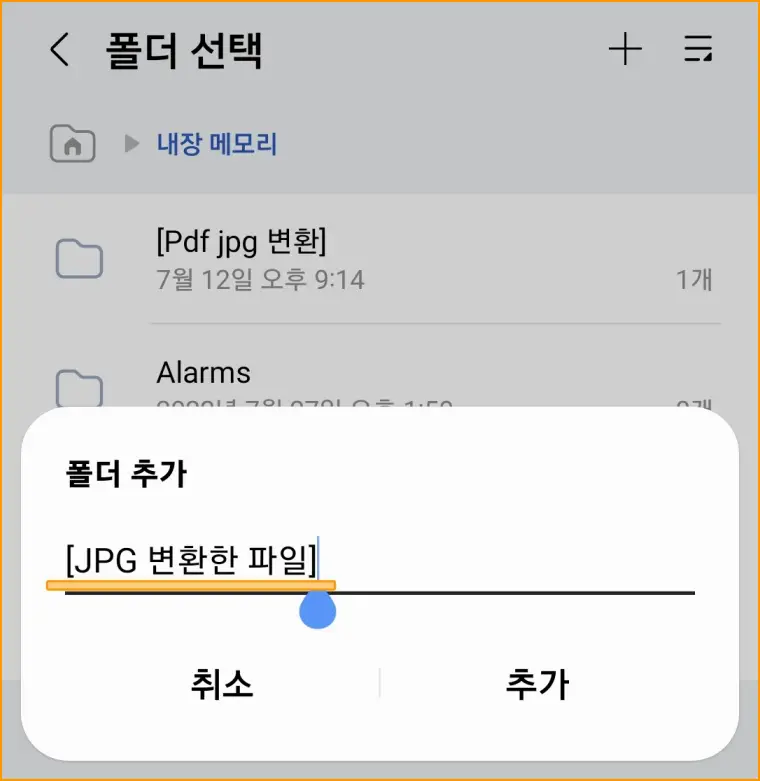 ▲ 이미지로 변환한 파일들을 저장하기 위해서 [내파일]앱이 실행됩니다. PDF 페이지가 많을 경우 페이지만큼 이미지 파일로 저장되기 때문에 하나의 폴더에 정리해 둬야 파일 정리도 편하고 찾기도 쉽습니다. 우측상단 + 모양의 아이콘을 눌러 원하는 제목으로 폴더를 추가해 주세요. 해당 폴더로 경로를 선택했으니 [완료]를 누르면 이미지 파일명 작성창이 뜹니다. 알기 쉽게 작성 후 [저장]을 눌러주세요.